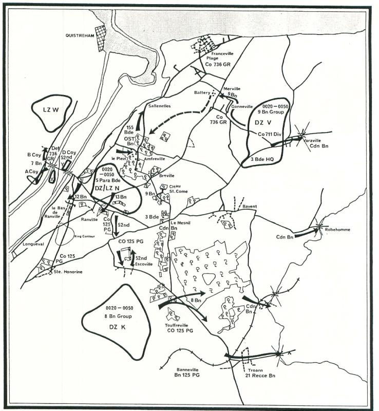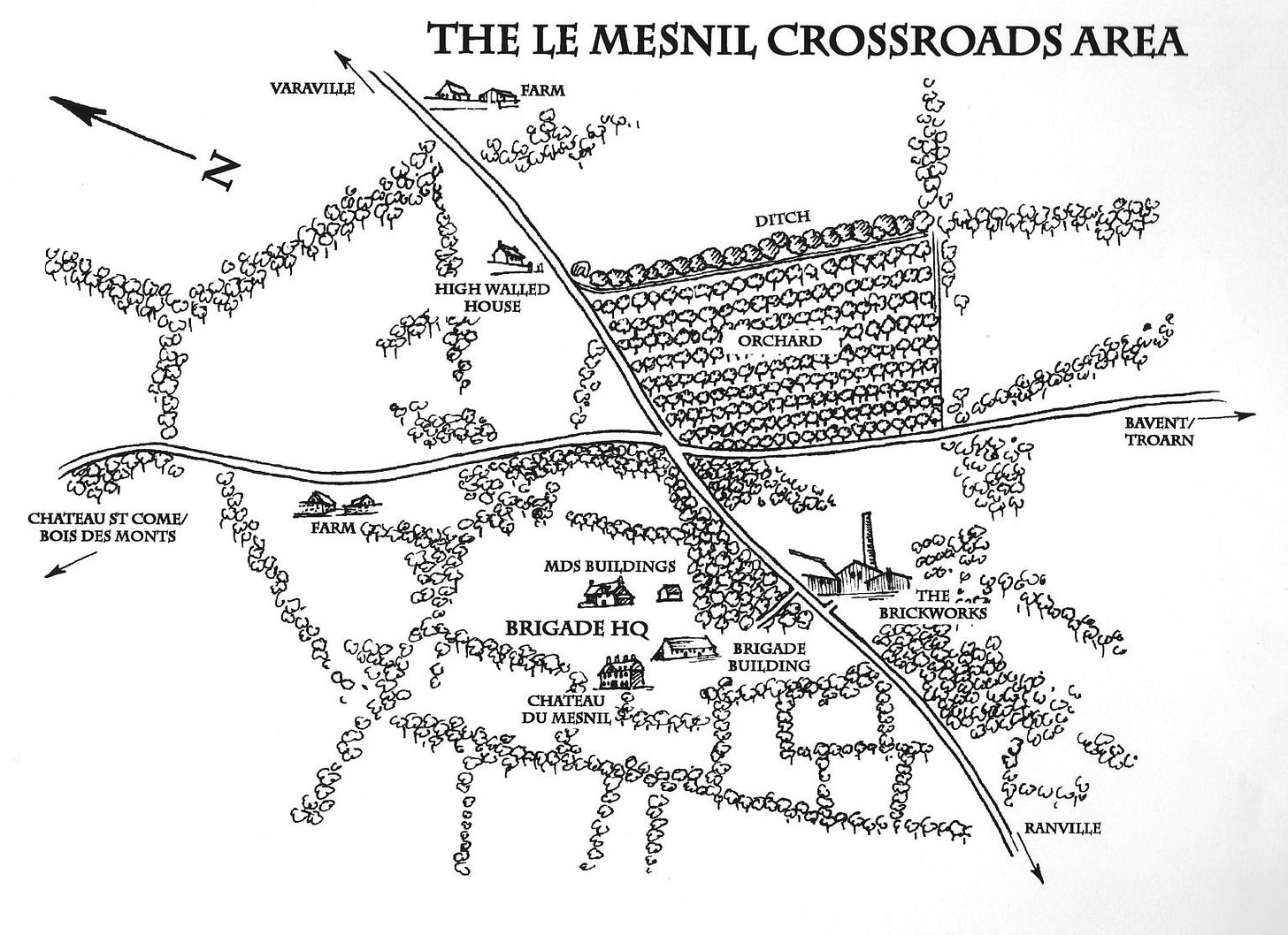 A party made up of Lieutenant Colonel Bradbrooke, Major Nicklin, a small portion of the Battalion Headquarters with medics from 224th Parachute Field Ambulance and fragments of the 3rd Parachute Brigade left the R.V. for Le Mesnil. Le Mesnil had been chosen for the H.Q. as it was nestled on the crossroads a vital junction sitting on a dominant feature and movement could be controlled in all directions.