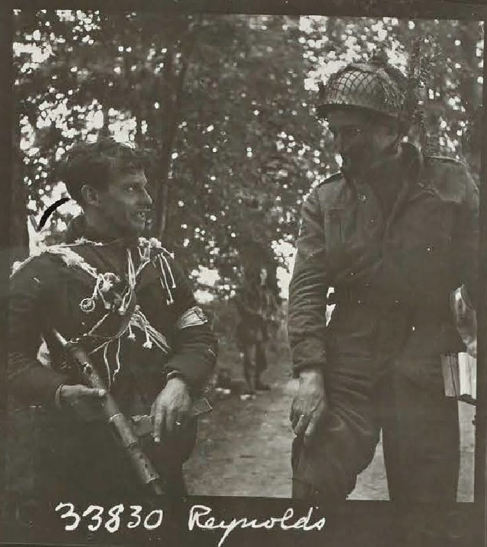 Reynolds like the rest of the battalion had a scattered drop, missing the drop zone as well as losing his 16mm Victor cine camera torn from his body during the descent. Two members of Reynolds stick did not fare too well with one landing on a tree breaking his leg and arm, another was captured and shot by the Germans survived by playing dead.